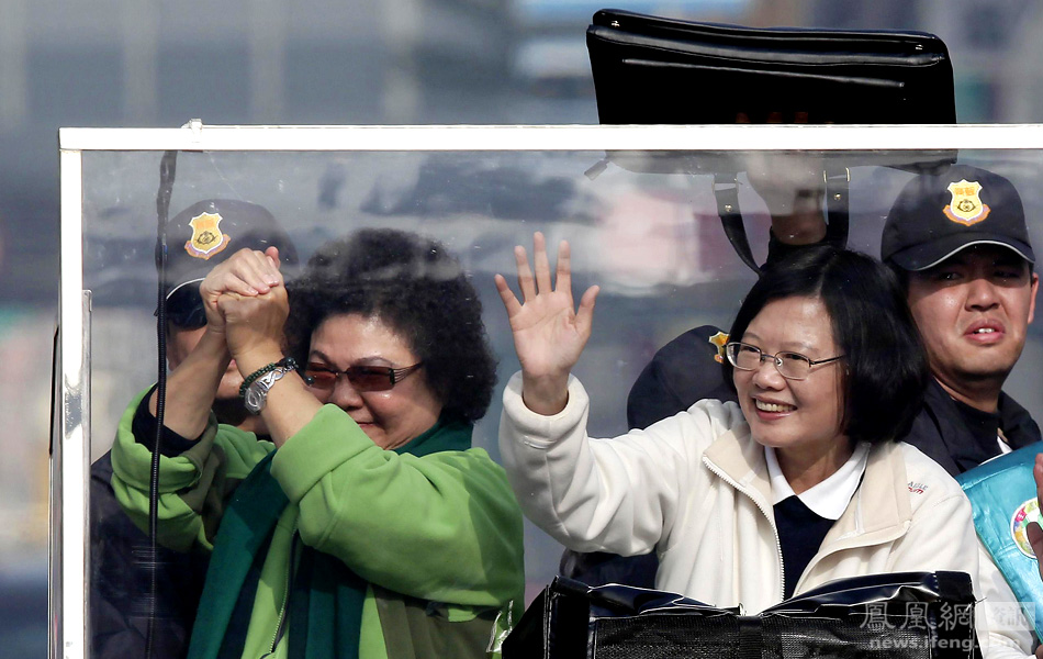 民进党“总统”候选人蔡英文在高雄扫街拜票,高雄市长陈菊陪同。