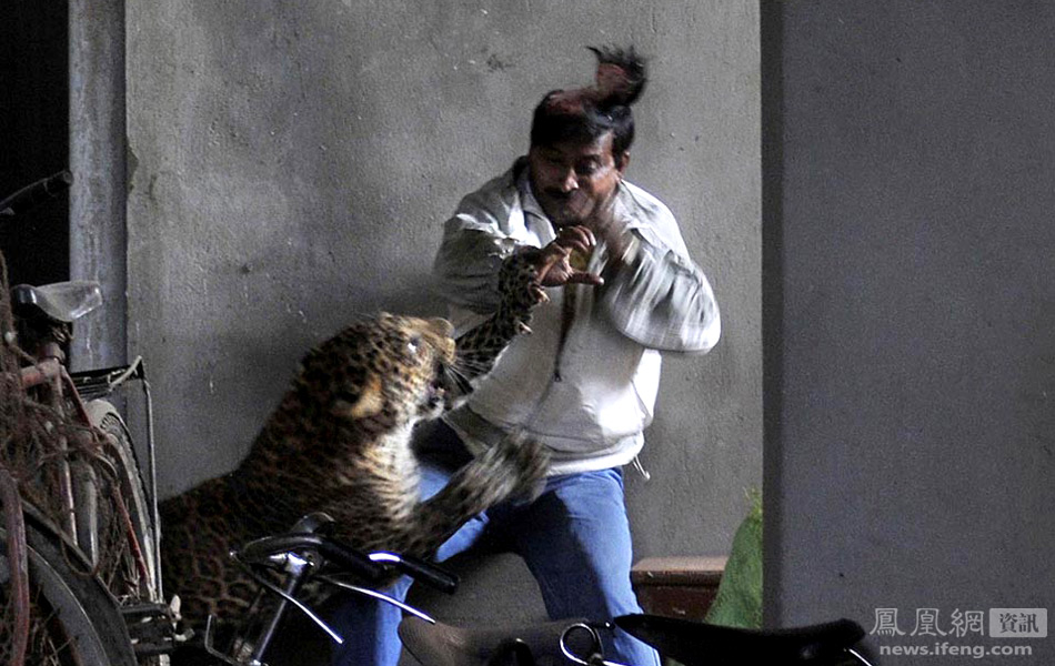 当地时间1月7日,印度古瓦哈提,一名男子正与撕开他头皮的豹子搏斗。该野生豹的袭击造成一人死亡、四人受伤。这头豹子现已被捕,随后将被放归自然。自然资源保护论者称,森林遭滥伐导致野生豹闯入居民区的事件不断增多。