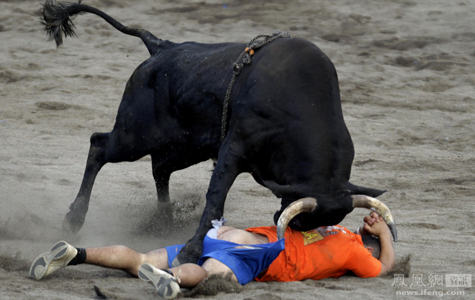 圣何塞一年一度的“斗牛节”上,一名参赛者与一头公牛搏斗。