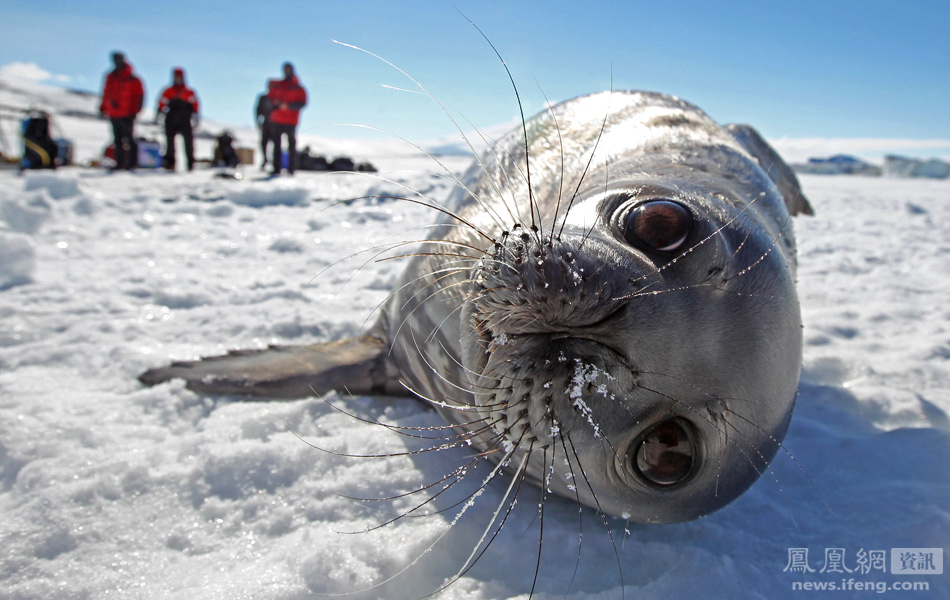 当地时间1月6日,南极洲罗斯海特拉诺瓦湾,一只海豹在科考队员附近晒太阳。