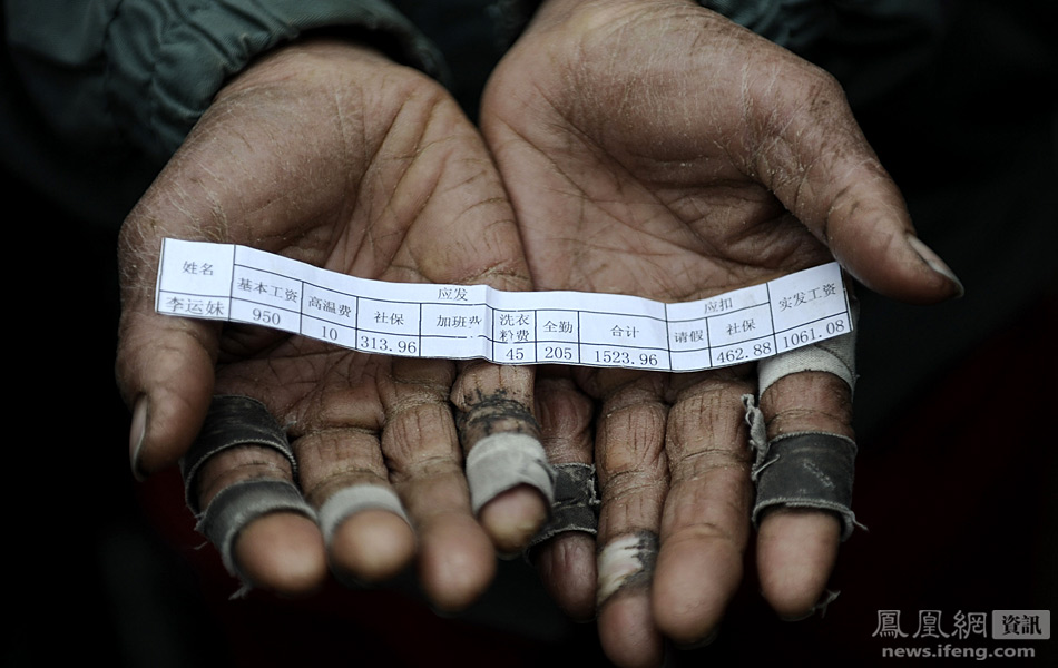 广州增城挂绿广场,五十余名环卫工聚集在此,称历年均发放的年终奖今年没了,向公司讨要说法。图为工人们手里的的工资条。