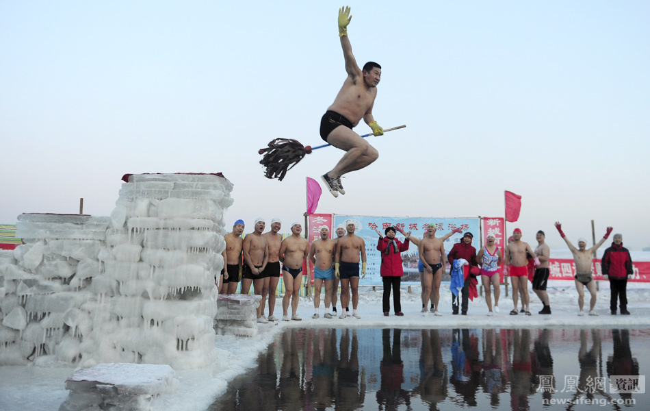 黑龙江哈尔滨,一名冬泳者骑在拖把上跳进松花江冰冷的江水中。