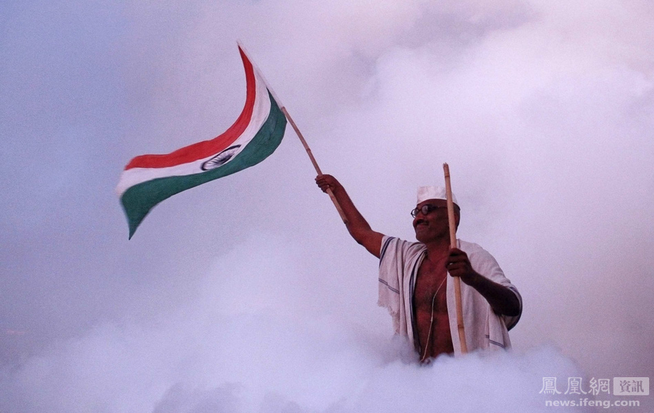 印度孟买,印度资深社会活动家安纳·哈扎尔(Anna Hazare)的支持者站在卫生工作者为灭虫喷出的烟雾中挥舞着印度国旗。
