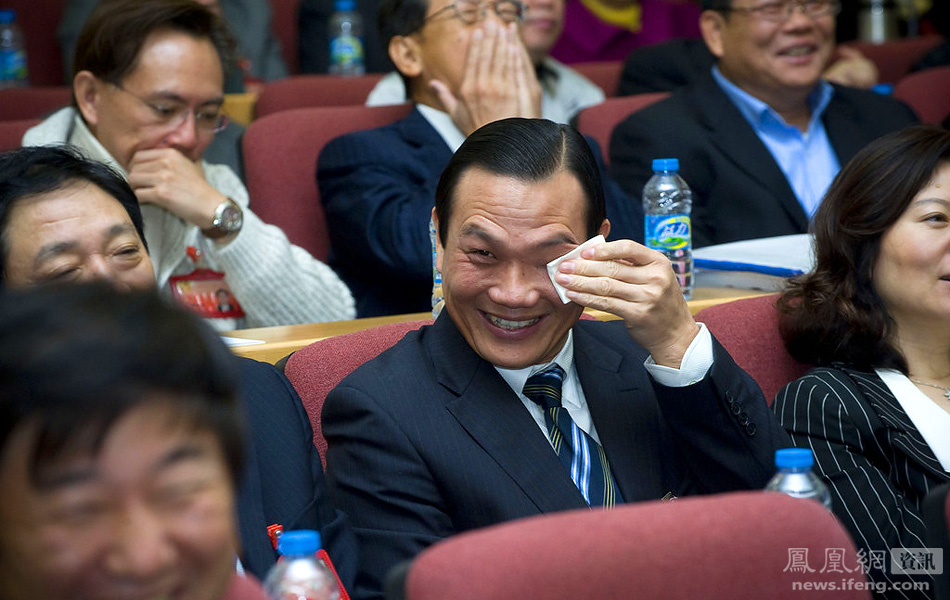 1月9日,深圳市政协五届三次会议上,一名委员笑出了眼泪,连忙用纸巾擦拭泪水。