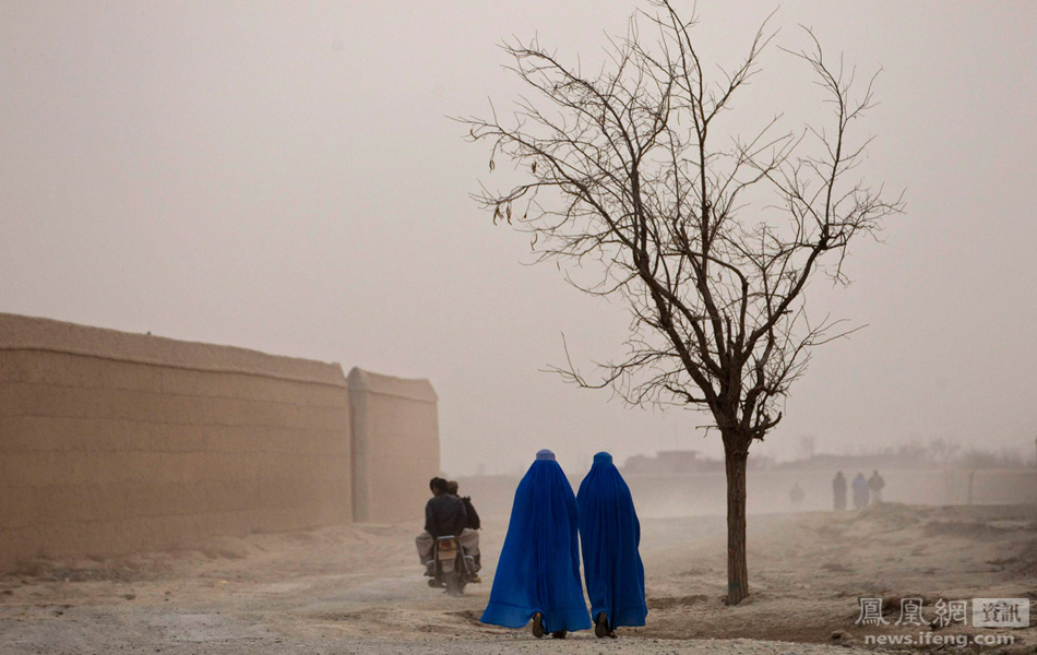 阿富汗喀布尔以北的巴格拉姆,两名阿富汗妇女身穿传统服饰burqas走过一棵枯树。