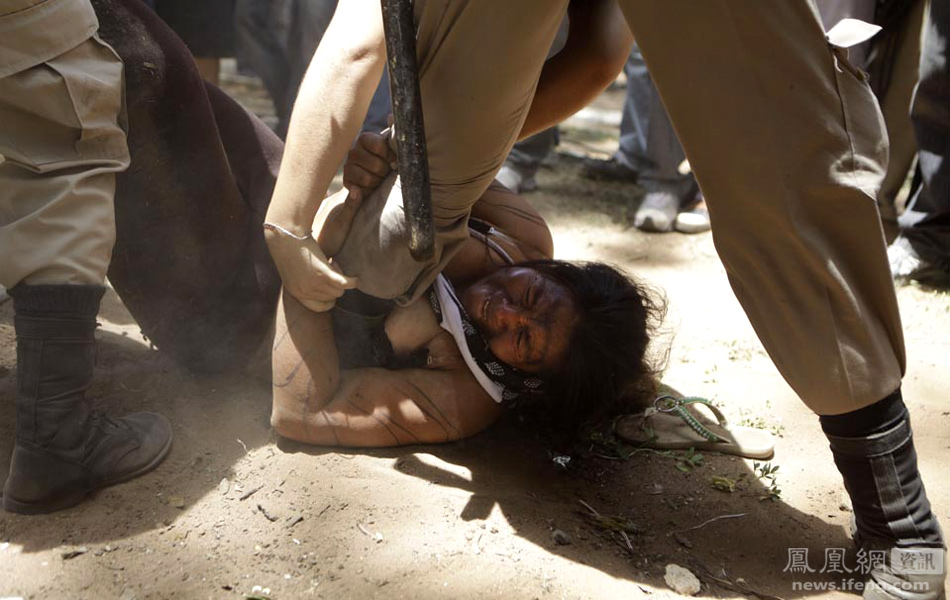 当地时间1月5日,巴拉圭亚松森的民众占领了一个广场,要求政府予以救助。图为来自阿瓦瓜拉尼族的利夫拉达·马丁内斯(Librada Martinez)与清理广场的警察扭打在一起。