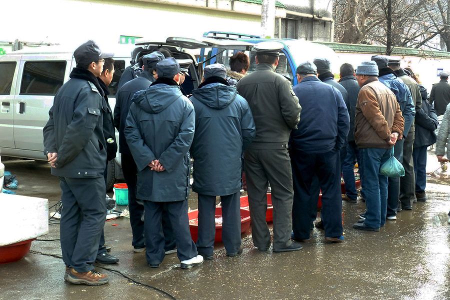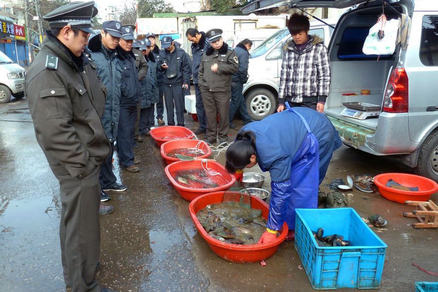 1月29日,南京锁金村一处路口,十多位身着制服的城管队员肃立围观占道经营的鱼摊,不一会,摊主便抵挡不住,匆忙撤摊。