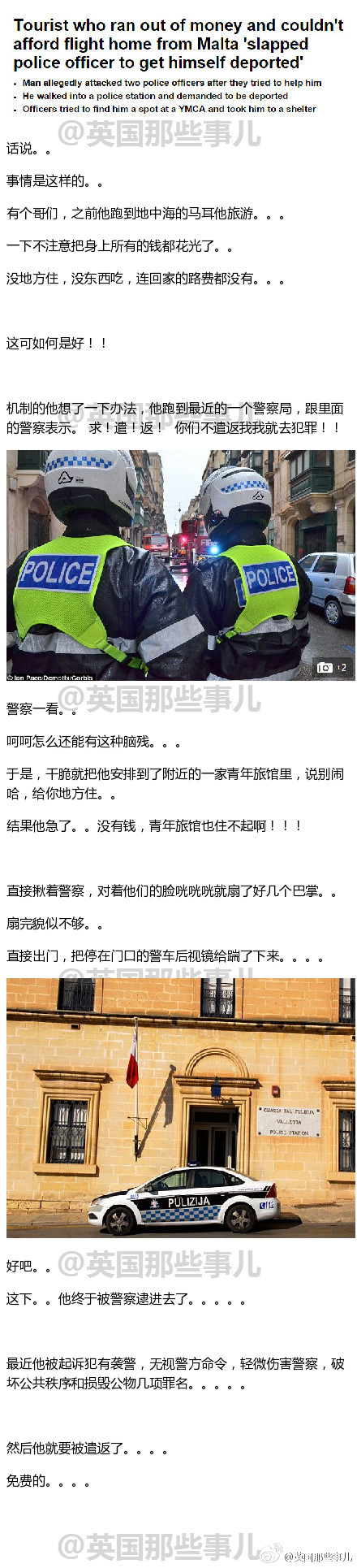 话说。有个哥们跑到马耳他旅游。。一下不注意把身上所有的钱都花光了。 没地方住,没东西吃,连回家的路费都没有。 机智之下他想了一个好办法。找到几个警察,扇了他们几个耳光。。。。。 然后,他就如愿以偿的被遣返了。。。