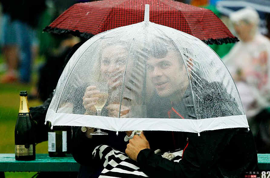 英国温布尔登,网球赛因雨中断,一对男女打伞等待。温布尔登网球锦标赛是网球运动中最古老和最具声望的赛事,是大满贯赛事中唯一使用草地球场的比赛。刚刚拿到法网女单冠军的中国金花李娜在第二轮早早出局。