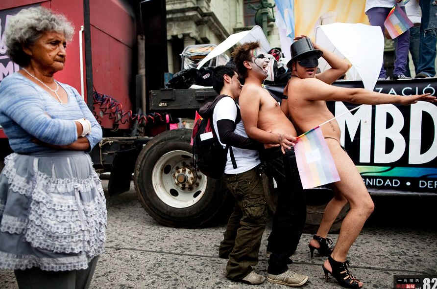危地马拉城,三名参加同性恋游行的男子在路人的注视下跳舞。近日,世界多个国家举行一年一度的同性恋游行活动,同性恋者上街狂欢,争取自身权益。近日,同性恋婚姻在纽约州取得合法化地位,这使得纽约州成为美国第六个实现同性恋婚姻合法化的州。