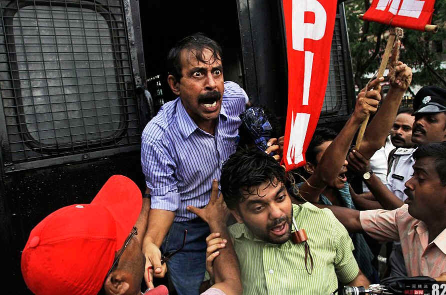 印度加尔各答,一名印度共产党成员抗议油价上涨,遭到逮捕。印度政府25日宣布再次上调部分燃油和天然气价格,各地民众对此反响强烈,纷纷走上街头进行抗议。
