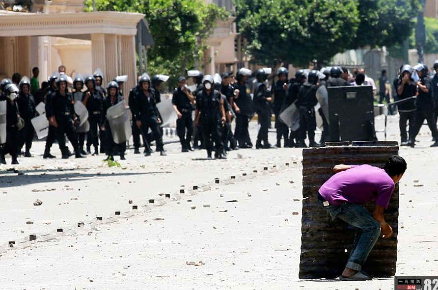 埃及开罗,抗议者手持自制盾牌向警方投掷石块。自6月28日晚上起,开罗数千名抗议者与安全部队爆发严重冲突,造成上千人受伤。埃及看守内阁总理谢拉夫指出,此次大规模流血冲突是“有组织、有预谋的”,他指责一些反动和敌对势力精心策划了冲突事件,旨在破坏埃及的稳定和发展。