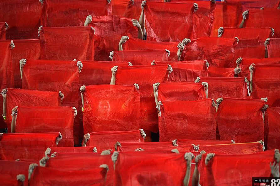 北京人民大会堂举行建党90周年文艺晚会,演员手举红布参加表演。