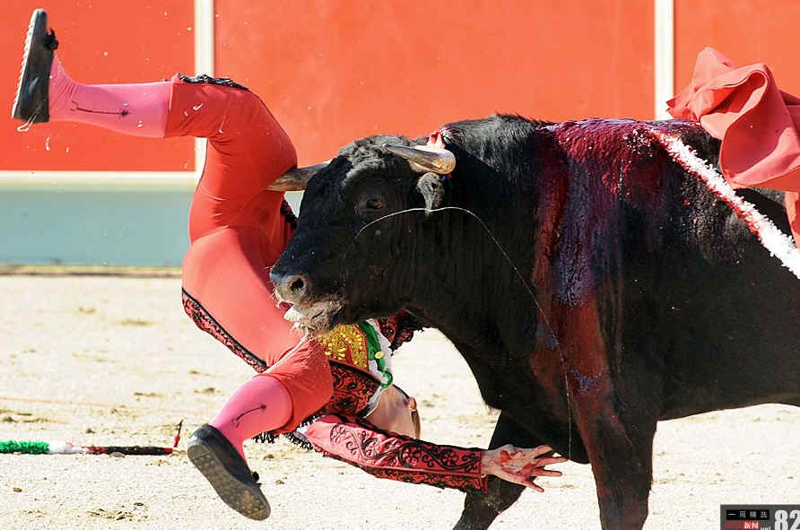 法国法国里厄姆,一名20岁的西班牙女斗牛士首次上场表演,就被牛角戳穿大腿,身体悬在半空,伤势不轻。