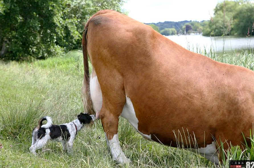 英国白金汉郡马洛,一只狗在母牛喝水时偷喝牛奶。