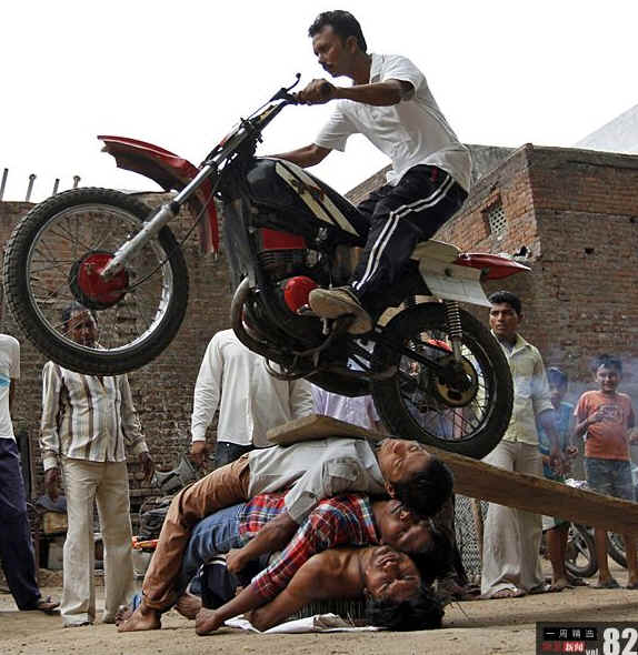 印度西部城市阿默达巴德,几名印度教徒表演杂技,庆祝传统节日檀车节。