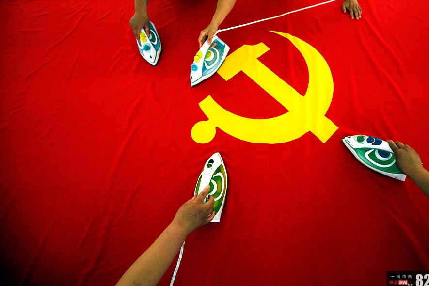 北京一家党旗生产厂,几名工人正在用电熨斗熨烫刚刚制好的中国共产党党旗。