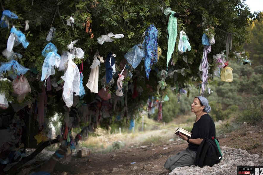 以色列萨费德一座古代学者的墓旁,一名犹太妇女用传统方式在树下祈祷,希望孩子能早日找到配偶。