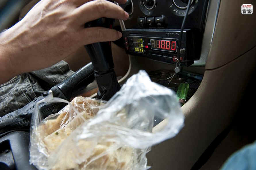 李师傅花费3元买了油饼作为早餐。然而油饼在车上放了两个多小时,他一直都没有时间把它吃掉。不能按时吃饭和长期久坐,使得胃病、前列腺疾病、颈椎腰椎疾病成为出租车司机的主要疾病。