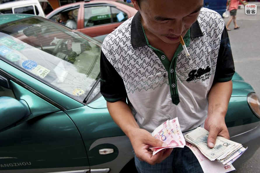 下午5点多,一名刚刚交班的司机坐在车边,结算一天的进账。刨去220元的白班“份子钱”和汽油费,一天的收入只有40元左右。买了包烟,吃了早饭和晚饭,再加上房租、水电费,一天下来,收支基本相当。每月挣的钱只剩下油补,上个季度政府补助4995元,白班和夜班四六分成,跑白班的司机每月可拿到约666元补助。