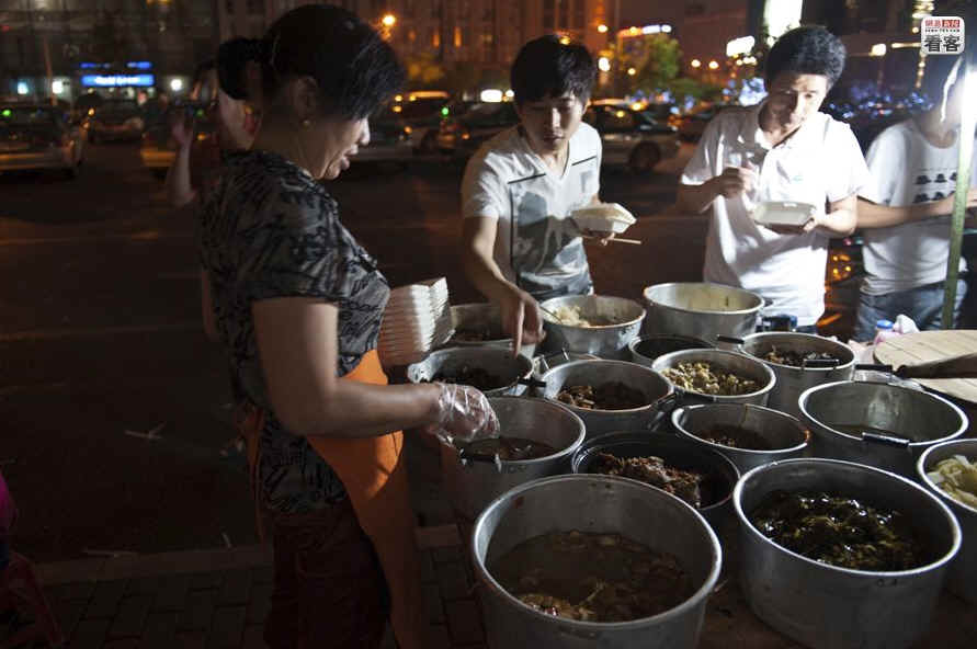 晚上,路边摊成为了出租车司机的服务区。司机们大多吃习惯了一家的口味,会在夜里11点左右聚集来,吃一顿夜间司机的“午饭”。9元一份,两荤两素。半夜的生意冷清,这一顿饭可以吃得相对安稳些。
