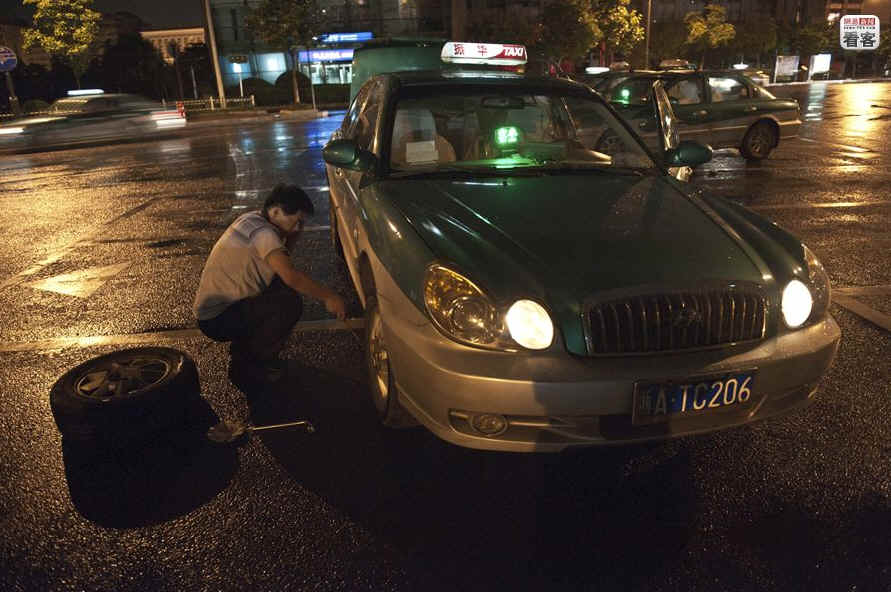 晚上12点多,路边的司机在自己换轮胎。司机说因为是晚上,出租车服务区都没有,更不要说是便宜的维修站了。只能靠自己解觉问题。