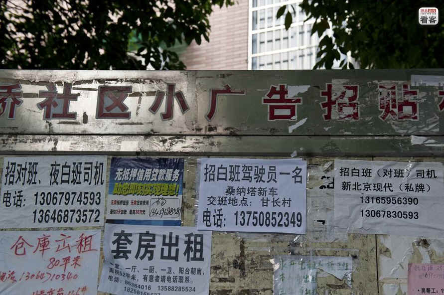 甘长村的告示栏上随处可见招聘出租车司机的广告。据不完全统计,今年杭州至今有400名出租车司机离开了这个行业。每天有200辆出租车因为找不到司机而闲置。当地的交通广播电台调侃称,找个夜班出租司机比中大奖都难。