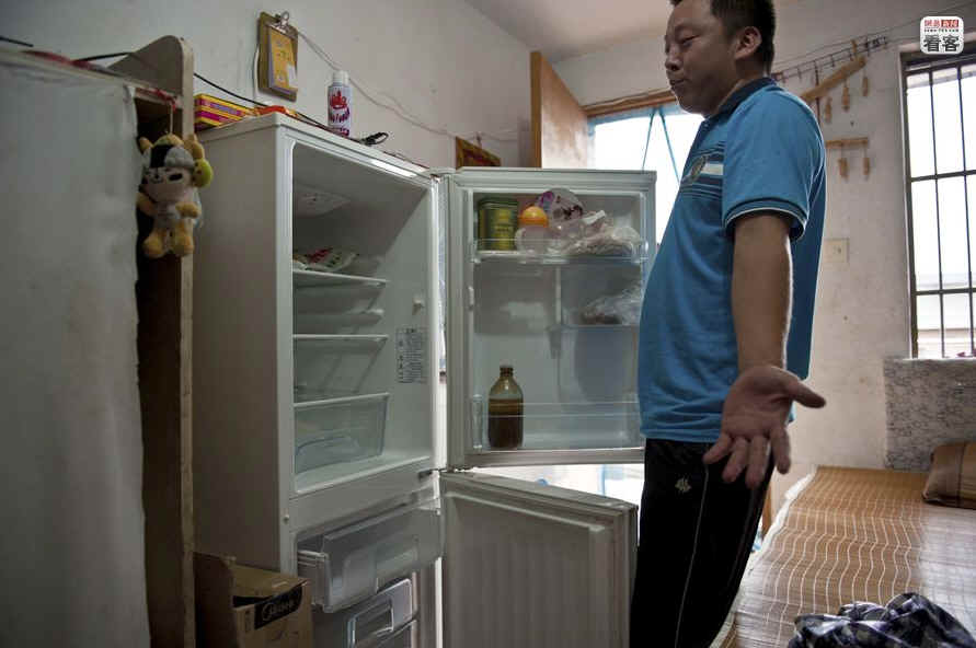 河南籍司机张师傅展示已经清空了的冰箱。不高的收入和高价电费让很多居住在甘长村的出租车司机都放弃了使用电冰箱和洗衣机等家用电器。张师傅年底即将离开杭州,家用电器和打包好的生活用品他准备下个月就邮寄回家。