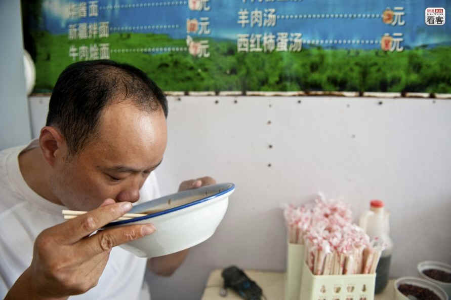 中午12点,李师傅拉了一趟跑郊区的活儿。回来的路上找了一家拉面店吃饭。李师傅说大部分时候他是不吃中午饭的,太浪费时间,虽然他吃完这碗拉面只花了不到15分钟。