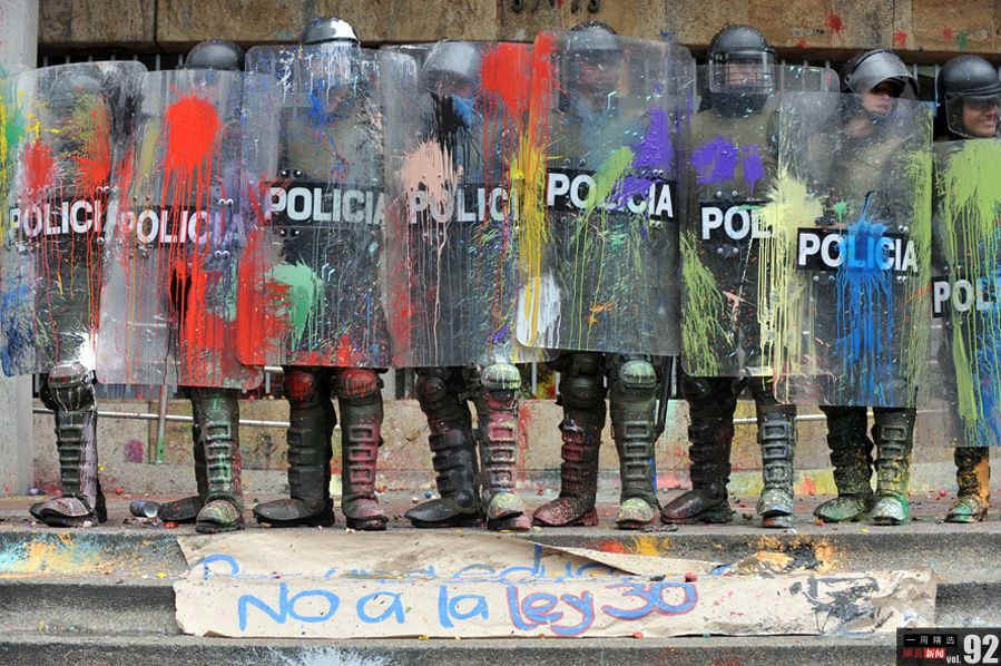 当地时间9月7日,哥伦比亚首都波哥大,防暴警察的盾牌被抗议者的“颜料球”染得五颜六色。上半年以来,哥伦比亚多个城市的学生教师多次进行大规模抗议活动,反对政府对公立大学的私有化改革。