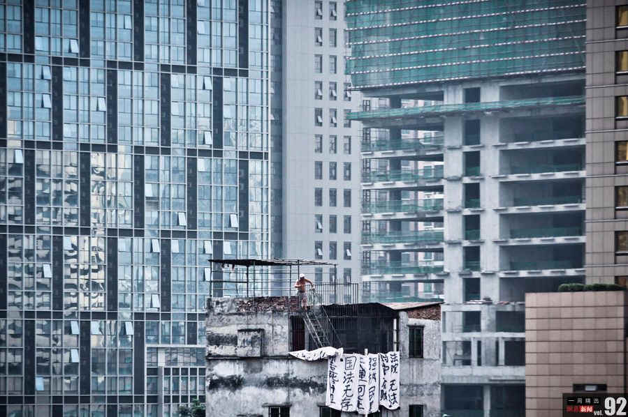 9月6日上午,广州杨箕村,一名屋主与警察激烈对峙。屋主储备了大量汽油,还在楼外挂出白色抗议条幅。在工作人员的谈判下,屋主最终同意和平搬迁。