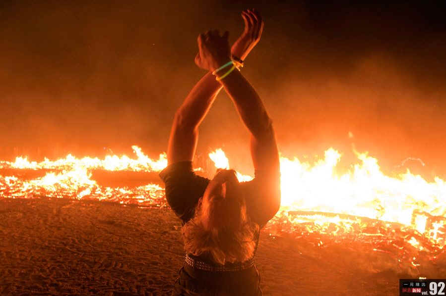 当地时间9月4日,美国内华达州黑岩沙漠,一名参加“火烧人”节的男子在火堆前舞蹈。“火烧人”节开创于1986年,是一个以年轻人为主力的反传统狂欢节。该节日为期8天,在这8天里,人们共同建造起一个“都市”。第8天,人们会焚烧一个12米高的木制男人雕像,同时也会把过去8天里搭建的房屋付之一炬。“火烧人”节在此时达到高潮。