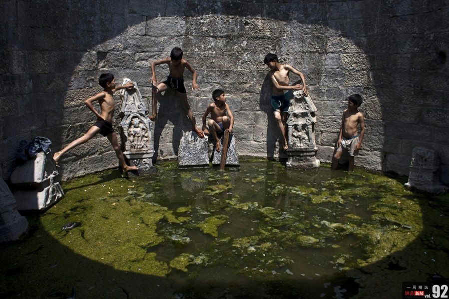 当地时间9月5日,印控克什米尔Laddu,一群孩童在一座印度教寺庙里戏水。