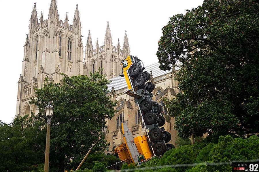 当地时间9月7日,美国首都华盛顿,一辆维修国家大教堂屋顶的起重机倒塌,砸坏了附近两栋建筑和几辆汽车,起重机作业员受伤。