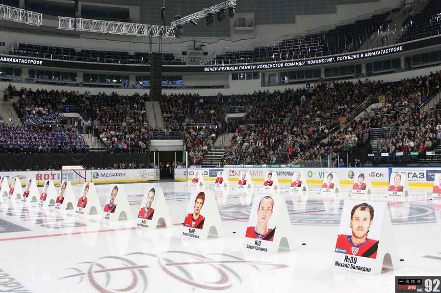 当地时间9月8日,白俄罗斯首都明斯克,“明斯克-舞台”体育中心冰球场上摆放了遇难队员的照片。 9月7日,一架雅克-42型客机在俄西部雅罗斯拉夫尔州坠毁,造成44人死亡。其中大多数为火车头冰球队队员。次日,欧洲多国民众在城市广场等地点悼念俄罗斯空难遇难者。