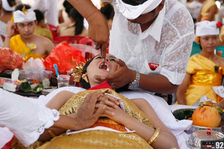 当地时间9月6日,印度尼西亚巴厘岛登巴萨市,一名女孩进行传统的锉牙仪式。锉牙仪式是巴厘岛印度教徒由儿童步入成人的重要的仪式。在仪式上,六颗门牙将被锉平。在巴厘岛,六颗门牙象征六种罪恶:欲望、贪婪、愤恨、焦虑、空想以及嫉妒。仪式完成代表人们正式成人,成为一个知道区分善恶的成熟个体。
