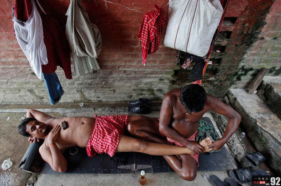 印度加尔各答,一名男子正在恒河桥洞下享受印度传统的按摩服务。