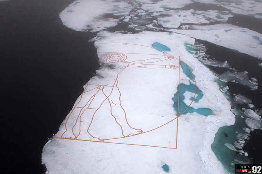 北极,艺术家约翰奎格利在海冰上制作了一幅达芬奇的名画——“维特鲁威人”,以此呼吁人们关注自然,关注气候。