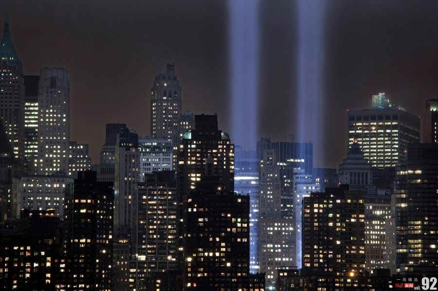 当地时间9月7日,美国纽约,世贸遗址“归零地”测试亮灯。11日是“911”事件10周年纪念,纽约将有一连串大大小小活动。美国总统奥巴马、前总统小布什都将出席这场纪念仪式。