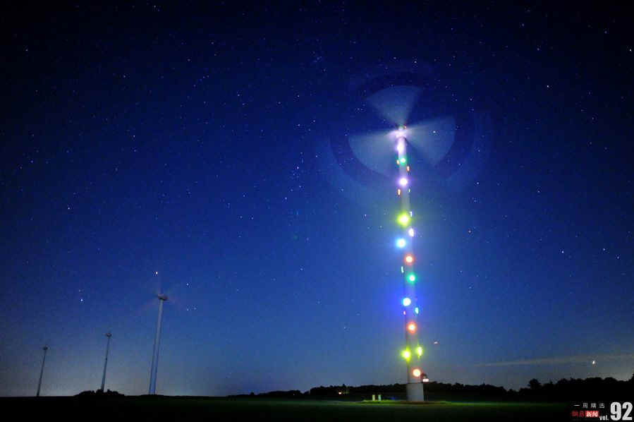 当地时间9月5日,德国北部城市汉诺威,一座装配彩灯的风力发电机在夜幕下熠熠生辉。这套灯光装置由法国艺术家帕特里克·雷诺设计。根据设计原理,彩灯的能源由风力发电机提供,风力越大,灯光越亮。