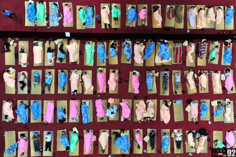 9月4日,武汉华中师范大学佑铭体育馆,近400名新生家长睡在校方提供的室内地铺。这是该校连续第5年在开学报到时为贫困生家长提供免费住宿。