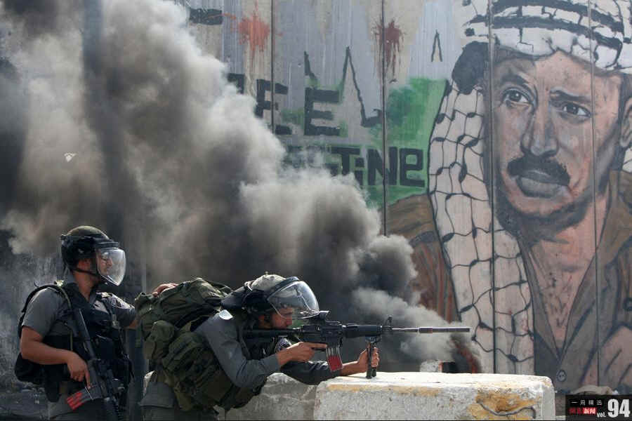 当地时间9月21日,约旦河西岸城市拉马拉的Qalandia检查点附近,以色列安全部队士兵躲避巴勒斯坦人扔来的石块。当天,成千上万的巴勒斯坦民众走上街头参加游行,支持巴民族权力机构主席阿巴斯在联合国大会上争取“入联”资格。