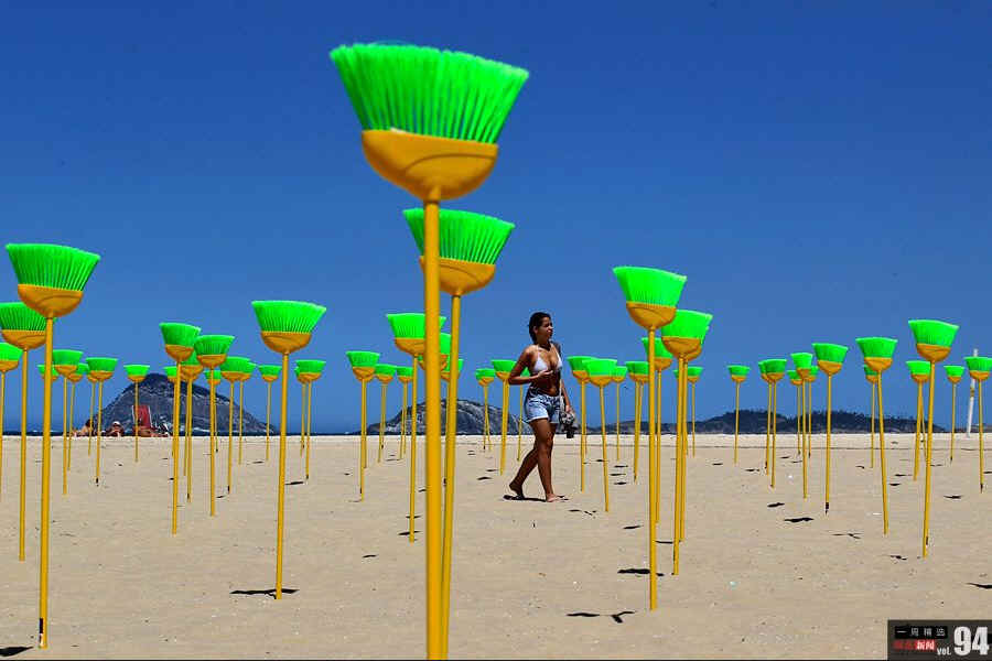 当地时间9月19日,巴西里约热内卢的Copacabana海滩,一名女性走过被倒插在海滩上的扫帚。这些扫帚由一个名为“和平里约”的非政府组织成员所摆放,象征着扫除“国会中的腐败”。594把扫帚代表了巴西国会的议员数。