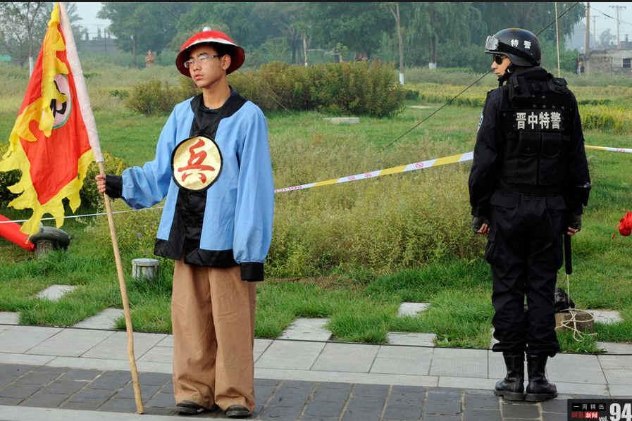 9月19日,平遥古城迎薰门广场,一名身着古代士兵服装的“兵丁”正在与现代特警一同站岗执勤。当日,由68名身着明清古装、手持长矛的兵丁为2011平遥国际摄影大展开幕迎宾礼“保驾护航”。