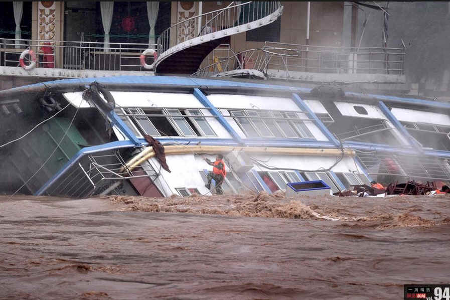 9月20日,重庆嘉陵江江面上,一名搜救人员冒险爬上正在倾覆的“周洪渔船”餐饮船,检查船内是否有被困人员。当天,重庆嘉陵江洪峰过境,江水湍急,导致主城嘉陵江渝澳大桥水域“周洪渔船”餐饮船副缆断裂,该船漂流过程中与“鑫缘渔港”餐饮船碰撞,导致“周洪渔船”餐饮船翻沉,船上11人落水后被全部救起。
