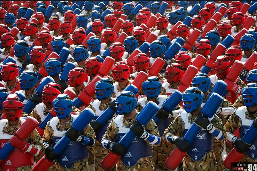 当地时间9月22日,伊朗首都德黑兰,纪念两伊战争阅兵仪式上,伊朗军队着搏击训练套装接受检阅