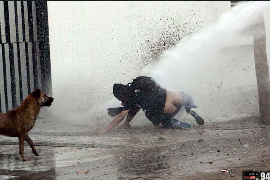 当地时间9月22日,智利首都圣地亚哥,约15万名反政府示威者举行大规模游行,以抗议政府在教育投入方面的大幅缩水。游行尾声有示威者与防暴警察爆发冲突,至少50人被逮捕。图为一名抗议示威者被防暴警察的水枪击倒。
