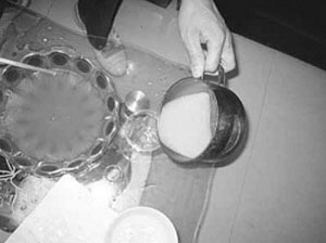 紧接着,他倒了半杯热水,然后开始用这些原材料调配方,每种原料里用手捏一点撒进水里,然后搅拌大约半小时。原本是白色麦乳精样颗粒状的海藻酸钠,开始慢慢溶解,刚才清澈见底的白开水,一会儿变成了黏稠的半透明的“鸡蛋清”。