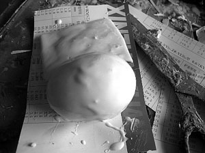 然后他把硅胶和固化剂调匀,反复刷在鸡蛋和纸片上,一直刷到约5毫米厚。连刷几遍后,鸡蛋和纸片被硅胶厚厚地兜了起来,从外面看像一把带“宽把手”的橡皮锤。一个多小时后,硅胶变硬。任某将纸片的外侧剪开,把事先放进的纸片抽出来。“宽把手”处的胶片就变成了两张皮,只见他使劲儿掰开口,将包在里面的真鸡蛋从中取了出来,这就变成了蛋壳模具。而由于树脂材质十分细腻,刚才样品蛋壳上的小颗粒也留在了模具上。