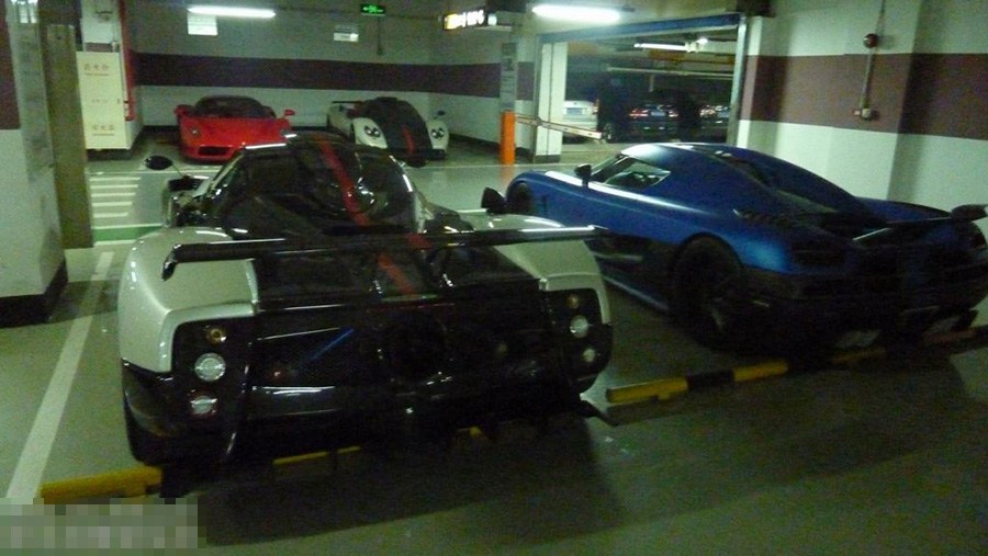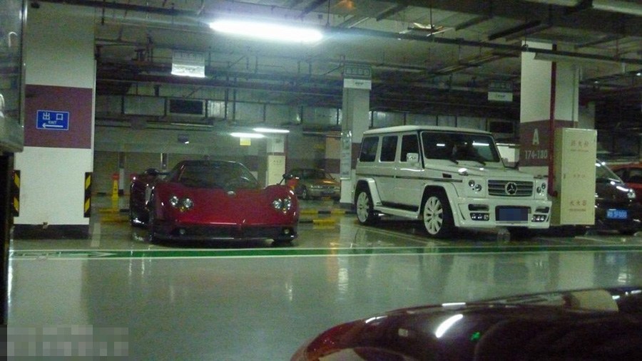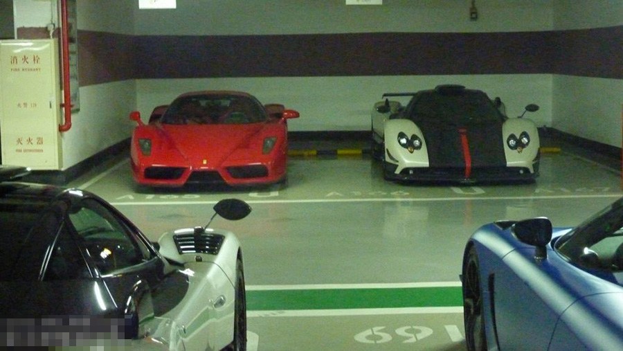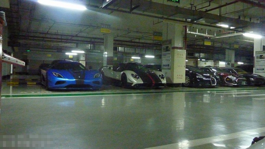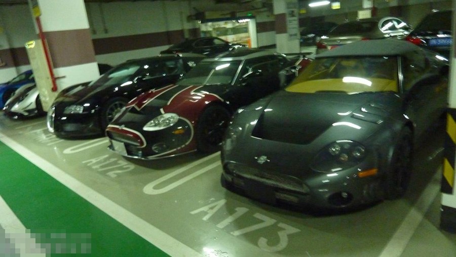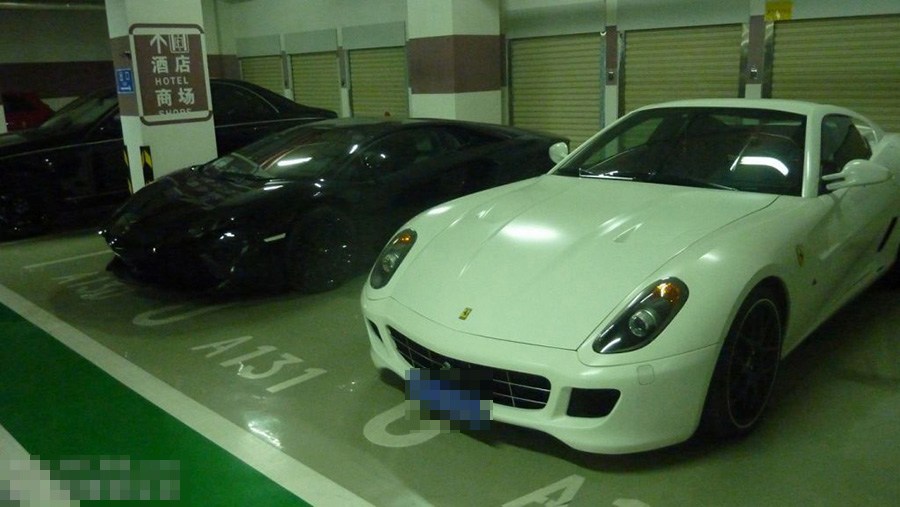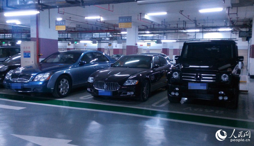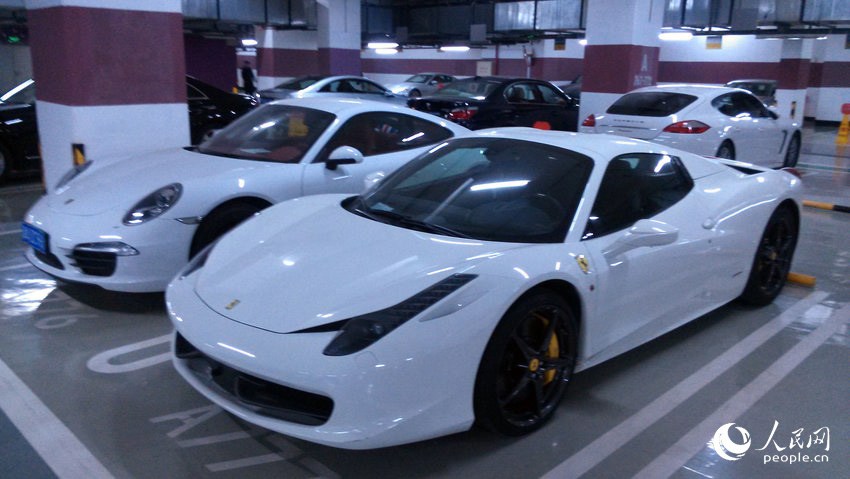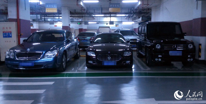 在临时停车区,普通常见的车辆居多,顶多有一些奔驰、宝马。而步行穿过停车管理岗亭的拦车杆,来到长期固定停车区,不用仔细寻找,就会发现前后左右随处可见平时少见的超级豪车,大都是几百万到上千万级别。首先是一辆银白色法拉利458跑车,然后又看见几辆宾利、几辆兰博基尼,还有玛莎拉蒂总裁、迈巴赫57、两门劳斯莱斯幻影跑车、劳斯莱斯古斯特,奔驰、宝马的顶级级别车和定制款。短短不到20分钟,记者看到约20辆价值几百万到千万的超级豪车。
